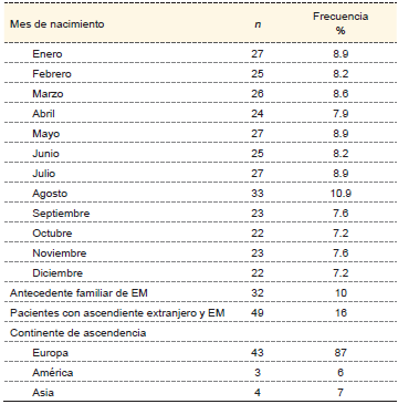 Se registró el mes de nacimiento de los pacientes y hubo una distribución muy homogénea, de la cual resaltaba levemente el mes de agosto, con el 10.9 %. En 32 pacientes (11 %) había referencia de algún familiar afectado por esclerosis múltiple, de los cuales fueron abuelos 0.4 %, padres en 1.1 %, hermanos en 3.4 % , tíos 1.5 %, primos 3.7 % y sobrinos 0.8 %. El 16 % tenía algún familiar ascendiente nacido en el extranjero, principalmente de Europa (Noruega, Inglaterra, Francia, Escocia, Alemania) y de otros países de América; esos parientes fueron más frecuentemente abuelos. El 87 % de los pacientes eran originarios de la Ciudad de México (cuadro II).