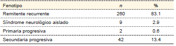 Los pacientes se clasificaron de acuerdo con el fenotipo clínico: 260 estuvieron en la variedad remitente-recurrente (EMRR) (83.1 %), nueve con síndrome neurológico aislado (CIS) (2.9 %), dos en la forma primaria progresiva (0.6 %) y 42 en la forma secundaria progresiva (EMSP) (13.4 %) (cuadro III). Los pacientes con fenotipo clínico de EMRR tuvieron una edad promedio de 39.2 años (DE 9.78) y la edad promedio de diagnóstico fue de 31.3 años (DE 9.54); la edad promedio de los pacientes con fenotipo clínico de EMSP fue de 53.35 años (DE 13.61) y la edad promedio del diagnóstico de esclerosis múltiple se dio a los 36.46 años (DE 11.77); la edad promedio de los pacientes con CIS fue de 36.89 años (DE 6.25) y la edad promedio de diagnóstico 32.11 años (DE 4.54). Para el caso de la EMPP la edad promedio fue de 56 años (DE 11.31) y del diagnóstico, 46.5 años (DE 6.36).