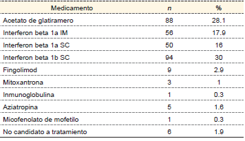 Con respecto a los tratamientos modificadores de la enfermedad que reciben los pacientes, al 28 % se le administró acetato de glatiramero, al 30 % interferón beta 1b, al 18 % interferón beta 1a IM, al 16 % interferón beta 1b SC, y a 3 % se le ministraron otros tratamientos (cuadro IV).