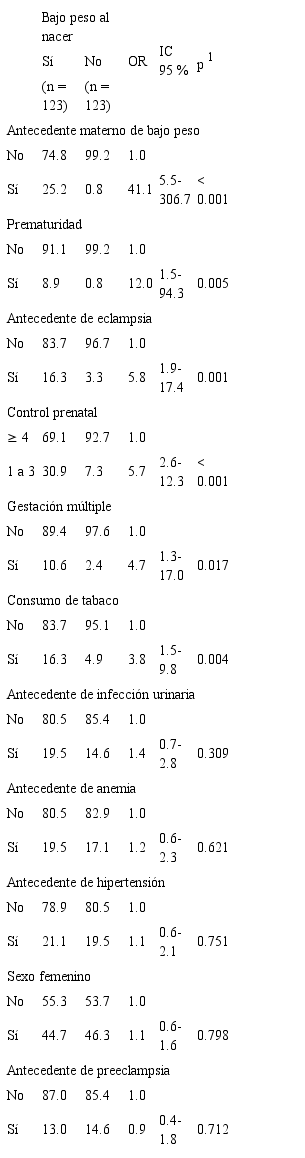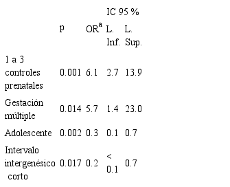 En el análisis bivariado, se encontraron asociaciones significativas para antecedente materno de bajo peso: prematuridad, antecedente de eclampsia, 1 a 3 controles prenatales, gestación múltiple y consumo de tabaco. Por otro lado, el no ser adolescente y no tener un intervalo intergenésico corto, fueron factores protectores. No se encontró significancia estadística para antecedente de infección urinaria, anemia, hipertensión arterial, sexo masculino del recién nacido, preeclampsia y estado civil soltera (cuadro II).