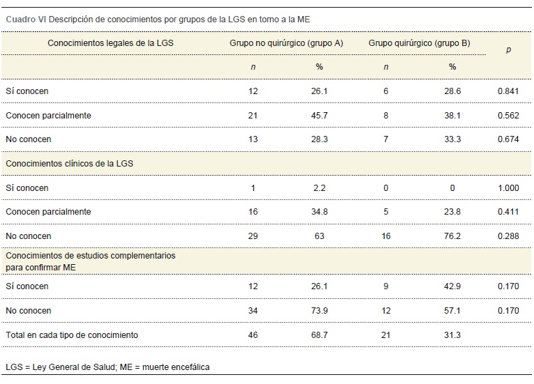 Como ya mencionamos, se dividió a la población encuestada en dos grupos: grupo A, que estuvo constituido por médicos no quirúrgicos y grupo B, que incluyó médicos quirúrgicos. En el grupo A el 47.8 % mostró una actitud positiva y en el grupo B un 20.9 %, p = 0.54. La participación en ambos grupos se muestra en las figuras 1 y 2. Más del 90 % de la población encuestada en ambos grupos desearía participar en un curso taller de muerte encefálica, así como ser potenciales donadores y receptores de órganos (cuadro IV). En relación con los conocimientos de ambos grupos, un alto porcentaje conoce parcialmente los artículos de ley que establece la Ley General de Salud sobre la muerte encefálica: grupo A = 45.7 % y grupo B = 38.1 %, p = 0.841. En lo referente a los conceptos clínicos se encontró que estos los conocen en forma parcial (grupo A = 34.8 % y grupo B = 23.8 %); en este rubro no existió diferencia significativa: p = 0.411. Un alto porcentaje de la población encuestada no conoce los estudios complementarios que establece esta ley para confirmar el diagnóstico de muerte encefálica: grupo A = 73.9 % y grupo B = 57.1 %, p = 0.170 (cuadro V). En el cuadro VI se muestran los conocimientos de ambos grupos en lo referente a lo establecido en la Ley General de Salud. No hubo diferencias significativas en cuanto a la actitud y los conocimientos al comparar ambos grupos.