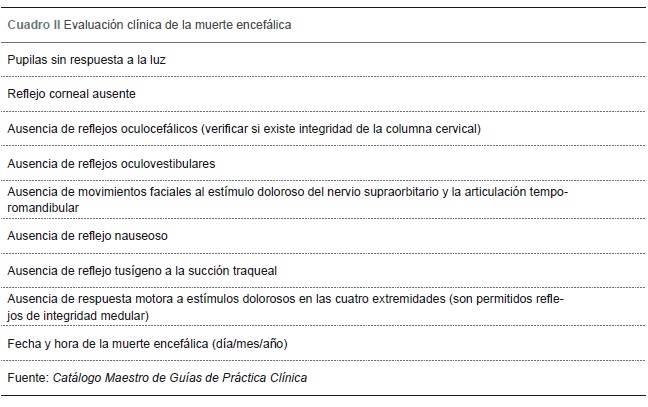En el Catálogo Maestro de Guías de Práctica Clínica para el Diagnóstico de Muerte Encefálica se establecen los prerrequisitos que debe reunir el paciente con sospecha de muerte encefálica (cuadro I).25