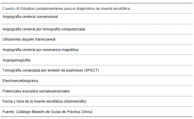 En el Catálogo Maestro de Guías de Práctica Clínica… se hace referencia a los estudios complementarios para demostrar la ausencia de flujo encefálico arterial, a fin de diagnosticar muerte encefálica (cuadro III).25