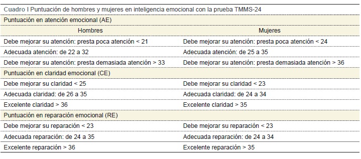 El TMMS de 24 elementos es una prueba que evalúa los factores atención emocional (AE), claridad emocional (CE) y reparación emocional (RE). La puntuación de cada uno de los factores se suma de la siguiente manera: del 1 al 8 para el factor atención emocional (soy capaz de sentir y expresar los sentimientos de forma adecuada), del 9 al 16 para el factor claridad emocional (comprendo bien mis estados emocionales) y del 17 al 24 para el factor reparación de las emociones (soy capaz de regular los estados emocionales correctamente). Posteriormente, con base en la puntuación, se procedió a la revisión de los cuadros, cada uno de los cuales presentó los puntos de corte para hombres y mujeres (cuadro I).