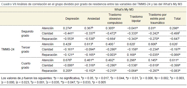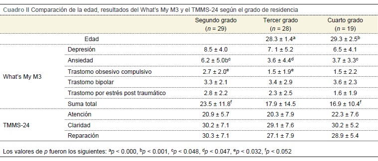 Se estudiaron 76 residentes, 29 de segundo grado (10 varones y 19 mujeres), 28 de tercer grado (9 varones y 19 mujeres) y 19 de cuarto grado (7 varones y 12 mujeres). La edad promedio en el grupo completo fue de 28.0 ± 1.8 años. Las siguientes puntuaciones se encontraron en el What’s My M3: depresión 7.5 ± 4.5, ansiedad 4.6 ± 4.6, TOC 1.96 ± 2.04, TBP 3.4 ± 2.5, TPSPT 2.3 ± 2.3 y la calificación final 19.8 ± 12.8. Las calificaciones con el TMMS-24 fueron: AE 21.0 ± 7.0, CE 29.8 ± 6.8 y RE 28.8 ± 7.1.