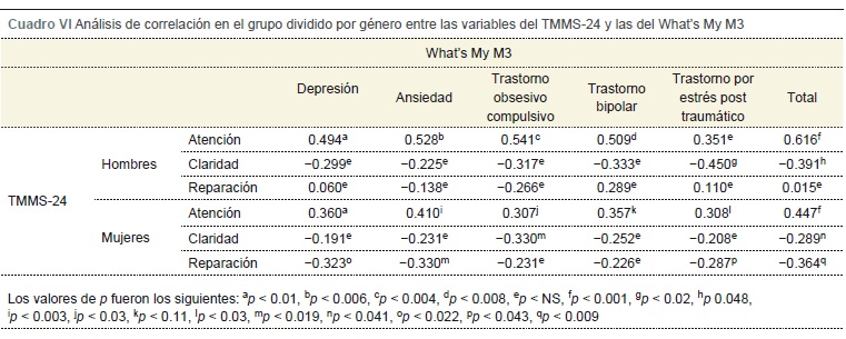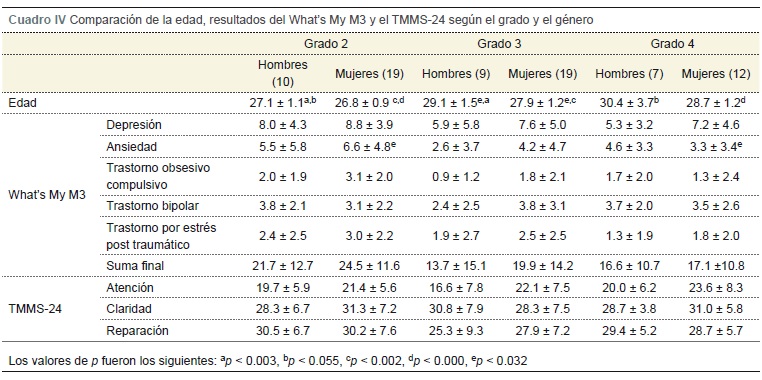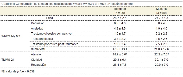 En el análisis por género, en el TMMS-24 la puntuación en el rubro de AE fue mayor en las mujeres y no hubo diferencias en la CE y la RE. En la puntuación del What’s My M3 no hubo diferencia estadísticamente significativa (cuadro III).