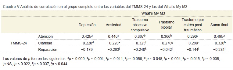 En el grupo completo hubo correlación positiva de la depresión, la ansiedad, el TOC, el TBP, el TPSPT y la calificación final con la AE. Lo mismo ocurrió con la CE pero de forma negativa. La RE se correlacionó de manera negativa con la ansiedad, el TOC y la calificación final (cuadro V).