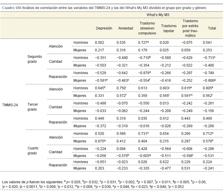 En las mujeres de cuarto grado hubo una correlación negativa de la depresión con la AE, negativa de la ansiedad, el TOC y el TPSPT con la CE. Y no hubo correlación alguna con la RE (cuadro VIII).