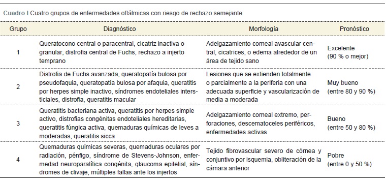 La categoría pronóstica más frecuente en la base de datos de trasplante de córnea en el servicio de Oftalmología del centro médico mencionado (y en ese lapso de tiempo) pertenece al grupo 1 y 2, que corresponde a los diagnósticos de queratocono y queratopatía bulosa, respectivamente.22 La enfermedad sistémica asociada más frecuente es la diabetes mellitus y el antecedente quirúrgico más común es la cirugía de catarata; entre las enfermedades oculares, el glaucoma se coloca en primer lugar en frecuencia y la vascularización corneal en la mayoría de los pacientes con rechazo corneal y queratitis herpética.23
