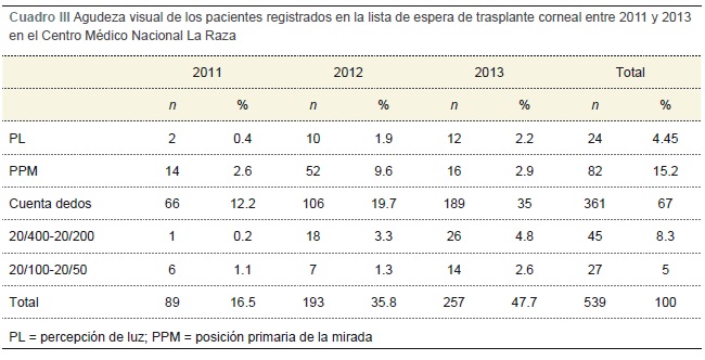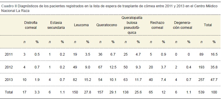 El Centro Médico Nacional La Raza es el hospital del Instituto Mexicano del Seguro Social que más trasplantes de córnea realiza a nivel nacional,21 con 250 en el último año. Se requiere precisar los elementos que contribuyen al conocimiento del manejo de dichos pacientes, primero conociendo las características de la población, para así analizar posteriormente los resultados de las variables que se obtendrán en este estudio.
