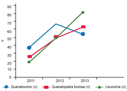 Se obtuvieron un total de 539 registros de la lista de espera de transplante corneal, 89 correspondieron al año 2011, 193 al 2012 y 257 al 2013. El diagnóstico más frecuente en la lista de espera de pacientes registrados fue el queratocono, con un porcentaje de 29.1 %, en segundo lugar el leucoma, con un 27.8 % y la queratopatía bulosa pseudofáquica fue el tercer lugar, con 25.6 % (cuadro II, figura 1). El 57.51 % de los pacientes correspondieron a la categoría pronóstica 2, con pronóstico muy bueno de transparencia corneal (entre 80 y 90 %), mientras que el 2.2 %, a la categoría pronóstica 4, con pronóstico pobre (entre 0 y 50 %). El rango de edad de los pacientes fue de 7 a 88 años, de los cuales el 69.9 % fueron mayores de 40 años. Se observó un predominio del género masculino con 55.6 % Con respecto a la agudeza visual que se registró al momento del ingreso a lista de espera, el 86.6 % del total de los pacientes resultó inferior a 20/400. Asimismo se obtuvo una visión de “cuenta dedos” en los diagnósticos de queratocono, leucoma y queratopatía bulosa de 77.7 %, 55.3 % y 52.8 %, respectivamente (cuadro III).