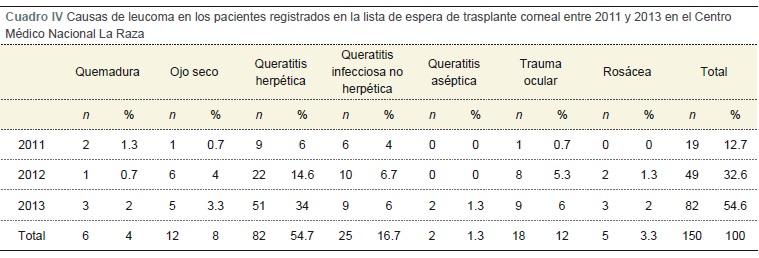 De los pacientes con queratocono, solamente cuatro presentaron cirugías previas (2.5 %), seis vascularización corneal (3.8 %) y 15 de ellos enfermedades previas, como hipertensión arterial (6.3 %) y diabetes mellitus (3.1 %). Del total de los pacientes con leucoma, el 54.7 % lo presentó secundario a queratitis herpética, el 16.7 % a queratitis infecciosa no herpética y el 12 % a trauma ocular, como principales causas (cuadro IV). La queratitis herpética como diagnóstico independiente a otras causas de leucoma fue el 15.2 % del total de la muestra y el 85.3 % presentó vascularización corneal. En la queratopatía bulosa psudofáquica se presentó vascularización corneal en 19 pacientes (13.7 %). Las enfermedades asociadas fueron artiritis reumatoide en siete pacientes (5 %), hipertensión arterial en 51 pacientes (36.9 %) y diabetes mellitus 2 en 35 pacientes (25.3 %). El diagnóstico de rechazo corneal se presentó en un 12 %, con una visión a su registro de “cuenta dedos” o inferior en el 98.4 % y con vascularización corneal el 27.6 %. La enfermedad crónico-degenerativa más frecuente fue la hipertensión arterial sistémica, presente en el 17.8 % de todos los pacientes. La principal enfermedad ocular asociada fue el glaucoma, en un 7.2 % del total, y la cirugía más frecuente como antecedente fue la cirugía de catarata.