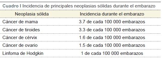 Las neoplasias sólidas más frecuentes asociadas con el embarazo son el cáncer de mama, de tiroides, de cérvix y el de ovario. La neoplasia hematológica más frecuente en el embarazo corresponde al linfoma de Hodgkin (cuadro I).4,5