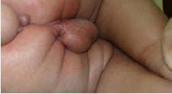 Hace poco estudiamos un recién nacido masculino de 25 días de vida, producto de la segunda gestación, obtenido por cesárea, con peso al nacer de 2900 g, sin hipoxia neonatal. Este paciente era hijo de padre campesino y madre dedicada a las labores del hogar. No había antecedentes de consanguinidad, malformaciones congénitas en la familia, ni existía endogamia. Fue traído a consulta por presentar una tumoración perineal. Esta se encontraba ubicada en el periné, sobre la línea media, dos centímetros por atrás del ano; era redonda, de tres centímetros de diámetro, estaba cubierta de piel y era blanda, fijada por un pedículo de piel al periné. En la parte media e inferior de la tumoración, presentaba dos mamelones cutáneos pediculados, separados a cada lado de la línea media, de 0.8 cm de largo por 0.5 cm de ancho, los cuales simulaban remanentes de escroto (figura 1). La radiografía de columna vertebral fue normal. No se encontraron otras malformaciones congénitas agregadas. Se realizó excéresis de la tumoración y el estudio histopatológico reportó que se observaron masas tabicadas de tejido adiposo regular y maduro, por lo que concluimos que el niño presentó un lipoma perineal.