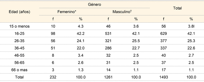 Se identificaron 1493 lesionados por causas externas del total de las personas atendidas por lesiones por el Instituto Autónomo Municipal Cuerpos de Bomberos de Valencia del estado Carabobo, 232 fueron mujeres (15.5%) y 1261 hombres (84.5%). La edad promedio de los lesionados por causas externas fue de 29.5 ± 12.0, el de menor edad tenía 7 años y el de mayor 98. Los grupos de edad mayormente afectados fueron los habitualmente considerados como los económicamente productivos, es decir, los que tienen entre 16-25 (42.1%) y entre 26-35 años (25.3%). La mayoría de los lesionados, sin distingo de género, se ubicaron en el grupo comprendido entre 16 y 25 años (p < 0.0000000, con diferencias significativas con cada uno de los grupos de edad construidos para este estudio) (cuadro I).