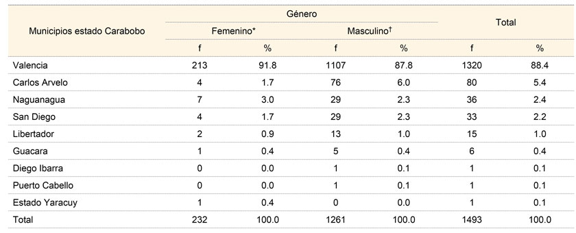 Las lesiones se produjeron en 88.4% (1320/1493 afectados por causas externas) en el municipio Valencia del estado Carabobo (p < 0.0000000, con diferencias significativas entre lesionados atendidos por causas externas en el municipio Valencia y cada uno de los municipios en que también se atendieron lesionados). Le siguen, muy distantemente en frecuencia, los municipios: Carlos Arvelo (5.4% [80/1493]), Naguanagua (2.4% [36/1493]), San Diego (33/1493), Libertador (15/1493) y Guacara (6/1493) (cuadro II)