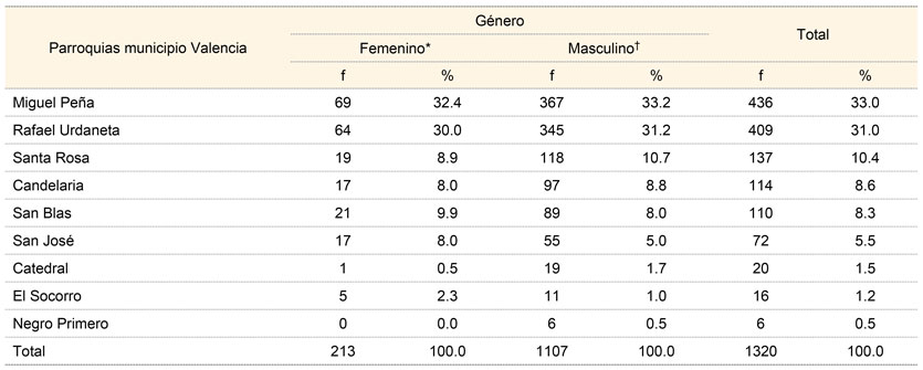 De las 9 parroquias civiles que conforman el municipio Valencia, son dos en las cuales se concentra el mayor número de lesionados por causas externas auxiliados por el servicio de atención prehospitalaria del Instituto Autónomo Municipal Cuerpos de Bomberos de Valencia del estado Carabobo: la parroquia Miguel Peña (33% [436]) y Rafael Urdaneta (31% [409]), sin diferencia significativa entre ambas (p = 0.18) pero sí entre ellas y cada una del resto de las parroquias que conforman el municipio en estudio (p < 0.0000000,) (cuadro III).