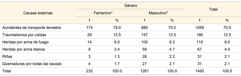 Los accidentes de transporte terrestre en ambos géneros (femenino [174/232] y masculino [885/1261]) representan el 70.9% de las lesiones por causas externas en el grupo estudiado (p < 0.0000000, con diferencias significativas entre quienes sufrieron lesiones por accidentes de transporte terrestre y cada una de las causas externas de lesión), le siguen los traumatismos por caídas (186/1493 [12.5%]), las heridas por arma de fuego (119/1493 [8.0%]) y las heridas por armas blancas en cuarto lugar (67/1493 [4.5%]) (cuadro IV).