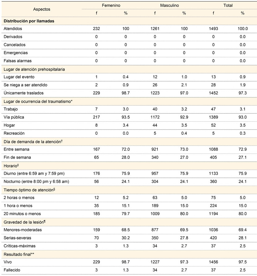 Conclusiones: los hombres jóvenes, económicamente productivos, de las zonas con mayor densidad poblacional y urbanismos son los más afectados por lesiones por causas externas; en ambos géneros, los accidentes de transporte terrestre son las causas más frecuente de lesión, de severidad menor-moderada; asimismo, la atención de emergencia prehospitalaria puede considerarse adecuada.
