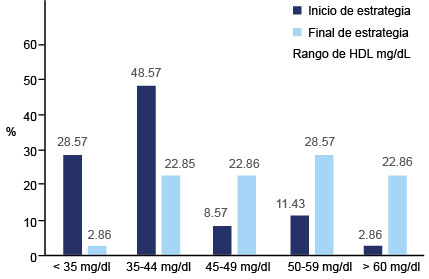 El 97% de los pacientes presentaron un tabaquismo negativo al inicio del estudio, el cual llego al 100% al final de la estrategia. Respecto al colesterol-HDL, hubo una reducción del porcentaje de pacientes que tenían inicialmente parámetros anómalos que definían un criterio de síndrome metabólico; a su vez, hubo una elevación de la proporción de sujetos que incrementaron sus cifras del colesterol-HDL posterior a la intervención (p < 0.05) como se muestra en la figura 1; generando, por ende, un incremento del factor protector. En razón de las cifras tensionales, estas también tuvieron una disminución significativa (p < 0.05), que se muestran en la figura 2, con una mejoría notable en todos los rangos de presión arterial, de manera más sobresaliente en los sujetos con presión arterial inicial de 130/85 mmHg.