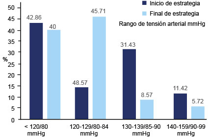 A su vez, como se describió previamente, hubo una disminución de las cifras tensionales estadísticamente significativa (p < 0.01), al comparar los registros iniciales y finales de la estrategia, lográndose un control de TAS/TAD < 120/< 80 hasta en un 40% de la población; datos similares a los encontrados previamente por nosotros en 2014,31 donde se logró una TAS promedio de 119.54 ± 11.66 y TAD de 77.02 ± 46.06 en un grupo de pacientes diabéticos al finalizar el programa DiabetIMSS a lo largo de un año, así como la mejoría de otras variables como glucosa en ayuno y posprandial, circunferencia cintura, IMC, colesterol y triglicéridos, que en este estudio no se reportan.