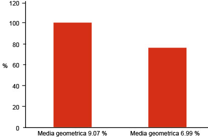 Al realizar la determinación del riesgo cardiovascular mediante el Framingham Score, se apreció una media geométrica de 9.07% inicial de RCV en la población de estudio, del cual se redujo a una media geométrica de 6.99% (figuras 3 y 4).