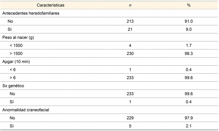 Del total de los 234 RN, 126 (53.8 %) fueron de sexo femenino, 58 (24.8%) prematuros, 21 niños (9.0%) con antecedentes familiares de sordera congénita o hipoacusia, 4 RN (1.7%) con peso menor a 1500 gramos sin datos de hipoacusia en la primera evaluación, 1 RN (0.4%) con Apgar menor de 6 y síndrome genético, 5 (2.1 %) presentaron anormalidad craneofacial, como se muestra en el cuadro I.