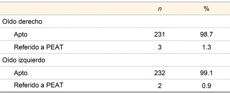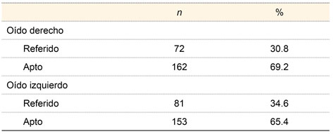 En la primera prueba del tamiz auditivo por EOAT, 72 RN (30.8%) resultaron referidos para la segunda prueba de oído derecho y 81 RN (34.6%) para oído izquierdo, según se muestra en el cuadro II.