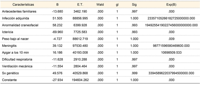 Resultados: la presencia de los factores de riesgo en los neonatos resultó significativa en la prueba de ómnibus (p < 0.05), valor de predicción por el modelo R cuadrado de Nagelkerke de 77%. Los antecedentes heredofamiliares, la infección adquirida, las anormalidades craneofaciales, el bajo peso, la dificultad respiratoria al nacer y los síndromes genéticos fueron factores que se asociaron de manera significativa (p < 0.05) a hipoacusia en neonatos.