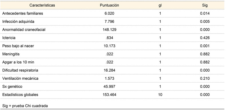 Los antecedentes heredofamiliares de pérdida auditiva neurosensorial, infección adquirida, anormalidades craneofaciales, bajo peso al nacer (menor de 1500 g), dificultad respiratoria y síndrome genético en un análisis bivariado (Chi cuadrada) fueron significativas, p < 0.05, como se muestra en el cuadro IV.