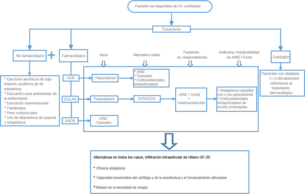 Los lineamientos actuales para el tratamiento del paciente con OA se ilustran en el algoritmo del anexo 2.