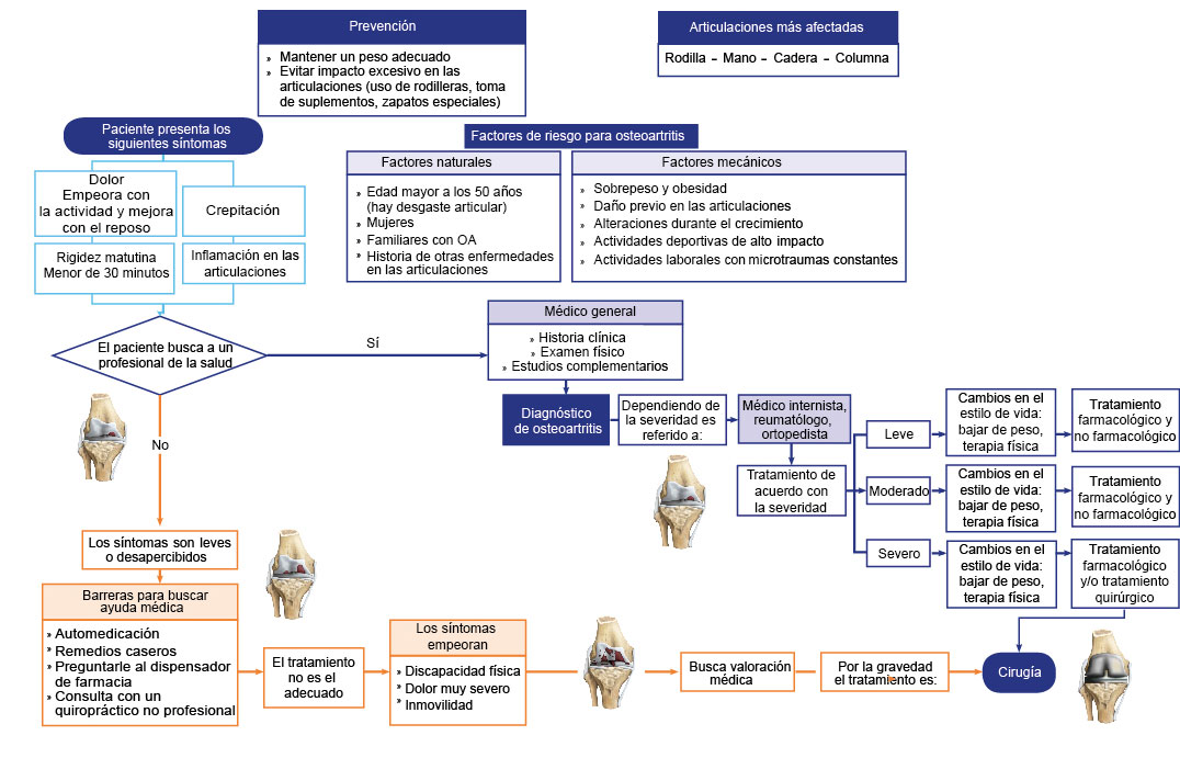 Los factores que influyen en la decisión de no procurar asistencia médica constituyen barreras para el inicio de un tratamiento pertinente; estos factores incluyen el uso de remedios caseros y la automedicación (hasta en el 66.6% de personas afectadas) y la consulta a un dependiente farmacéutico (18 a 31%) o a un quiropráctico no profesional (22%). Sin embargo, dado que, por una parte, es frecuente que la persona piense que el dolor osteoartrítico es “normal” del envejecimiento y que, por la otra, suelen transcurrir aproximadamente 7.7 años entre el inicio de la sintomatología y el diagnóstico médico de OA, es probable que durante ese lapso el paciente no solo no busque un tratamiento médico especializado, sino que además tal intervalo de tiempo sea suficiente para que la sintomatología empeore, en forma tal que, cuando la persona consulta al médico, su padecimiento se haya tornado severo, incluso al grado de no dejar como opción otra que el tratamiento quirúrgico.