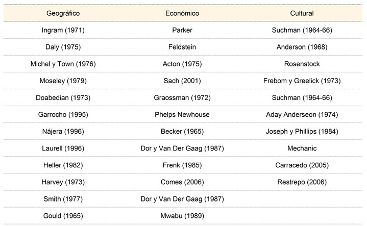 Como se estudió en los determinantes para la accesibilidad, son tres elementos básicos bajo los cuales el debate teórico ha girado para comprender los elementos que interactúan al momento de que la persona tiene la necesidad de atención. En el cuadro I, se puede observar un listado de autores que han escrito sobre la accesibilidad en los diferentes enfoques de análisis, los cuales se han abordado desde la visión económica, geográfica o cultural.
