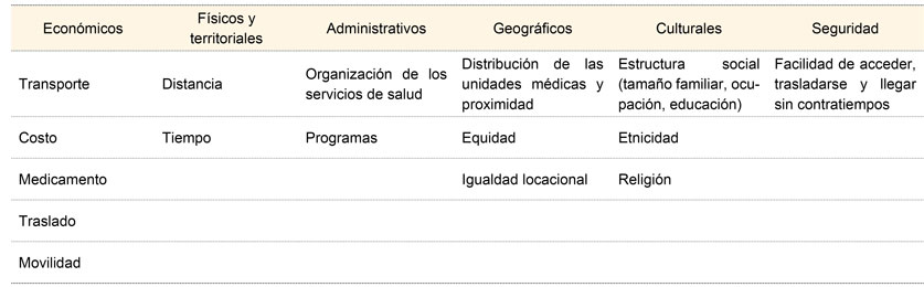 Al hablar de las dimensiones, se pueden enunciar las categorías que abren el debate, pero también que enriquecen la comprensión del problema de la accesibilidad. En este caso, se agrupan en cinco grupos o dimensiones: económicos (niveles de ingreso), sociodemográficos (sexo, edad, escolaridad), geográficos (distancia física y relieve), seguridad (acceso libre de riesgos) y organizacionales (administración y gestión de servicios) (cuadro II).