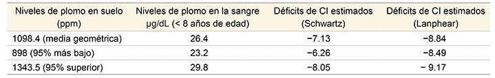 Con los modelos de Lanphear et al. y Swhwartz se estimó que los 11 niños menores de ocho años de edad, que hipotéticamente estarían viviendo en las 19 casas-talleres, probablemente tendrían una pérdida entre 7.13 (Schwartz) y 8.84 (Lanphear et al.) puntos de CI como resultado de este tipo de exposición al plomo (cuadro III).