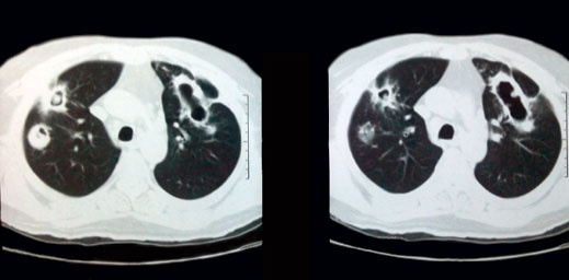 Presentaron participación pulmonar 17 de 28 casos, los cuales tuvieron presencia de infiltrado intersticial y reticular principalmente; en ocho de esos casos con GPW se identificaron nódulos pulmonares fijos, de distribución bilateral y en algunos casos cavitados (figuras 2 y 3). En un solo caso con GPW solo se documentó cisuritis. Ocho casos presentaron solo infiltrado intersticial difuso, seis correspondieron a SchS y cuatro de esos casos tenían antecedente de asma. Estos pacientes presentaron usualmente molestias respiratorias, entre las que predominó la dificultad respiratoria y la tos productiva mucopurulenta y hemoptoica en pacientes con GPW, en tanto que en pacientes con SChS la tos fue seca y persistente, sobre todo en los pacientes con asma. Estas manifestaciones concatenadas a la sintomatología del tracto respiratorio superior complicaron aún más el bienestar de los pacientes y generaron fatiga y dificultad para dormir. En cuatro casos presentaron daño permanente, en tres casos los pacientes requirieron oxígeno suplementario, y uno de estos casos con SChS desarrolló hipertensión pulmonar y otro con GPW desarrollo estenosis traqueal y fue incluido en un protocolo para dilatación frente a cirugía. La severidad de la participación pulmonar y renal fue determinante para el deceso de una paciente con GPW.