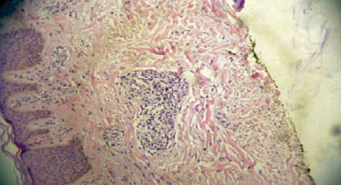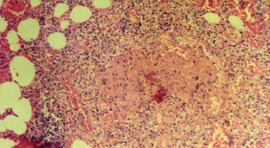 Por otra parte las manifestaciones en el tracto gastrointestinal se detectaron en cuatro pacientes (tres casos con GPW); y aun cuando fue baja la frecuencia, por el contrario la severidad y la gravedad fueron considerables. Estos pacientes presentaron abdomen agudo, por lo que fue necesaria cirugía de urgencia. Un caso presentó perforación intestinal y fue necesaria la resección y la realización de colostomía. Otro caso presentó hemorragia de tubo digestivo y se le practicó laparatomia; los hallazgos quirúrgicos fueron úlcera duodenal y apendicitis; asimismo, el estudio histopatológico de la pieza quirúrgica fue consistente con vasculitis granulomatosa (figura 4). Finalmente el último caso presentó dolor abdominal agudo y fiebre de 40 oC; la paciente fue intervenida quirúrgicamente y los hallazgos fueron: isquemia intestinal y pancreatitis edematosa. Solo un caso de SChS tuvo afección gastrointestinal; en él, el paciente presentó hemorragia del tubo digestivo alto y los hallazgos de la endoscopía reportaron pangastropatía mínima. Se trató con omeprazole y se resolvió el evento.