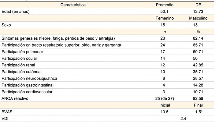 Methods: We studied 28 cases with ANCA-associated vasculitis in the aforementioned area. The classification was made according to the ACR 1990 criteria, the Chapel Hill 2012 consensus, and the EULAR 2007 recommendations. We collected demographic data, as well as data of clinical manifestations, laboratory, management and outcomes. The activity was established using the Birmingham Vasculitis Activity Score (BVAS) and the damage using the Vasculitis Damage Index (VDI). We used paired t test and 95% confidence intervals (95% CI).