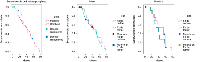 Resultados: se usó la estimación de Kaplan-Meier para calcular la supervivencia. Se comparó la supervivencia dependiendo del tipo de fractura y no se encontró diferencia estadísticamente significativa (p = 0.97). En el subanálisis, se comparó el tipo de fractura en el sexo masculino (p = 0.21) y el sexo femenino (p = 0.316) y no hubo diferencias estadísticamente significativas en la supervivencia. Esto difiere de los hallazgos de la literatura. Se utilizó la prueba t para evaluar la supervivencia en meses según el sexo masculino (39.61 ± 19.1) y femenino (36.58 ± 23.19), lo que demuestra una diferencia significativa en ambos grupos (p = 0.037).