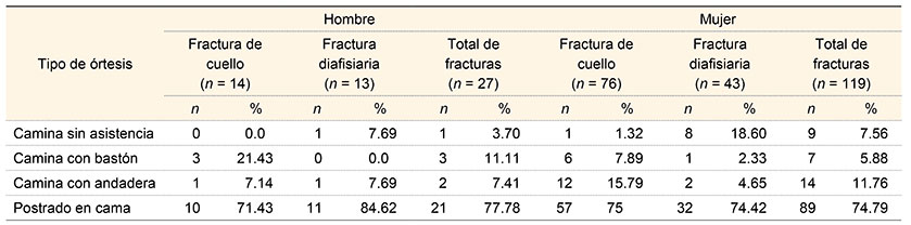Se trata de un estudio analítico, observacional y retrospectivo. Se analizó la base de datos del Departamento de Cirugía Ortopédica y Rehabilitación del Hospital General de México. Se analizaron todos los pacientes de edad avanzada del 1 de enero de 2010 al 31 de diciembre de 2014 con el diagnóstico de fractura de cadera y fractura de fémur del eje medio. Los datos demográficos (fecha de fractura, diagnóstico, edad, sexo, tipo de fractura y días de hospitalización) fueron tomados del expediente médico. El seguimiento se realizó a través de una entrevista telefónica con el paciente o el proveedor de atención médica. Fueron evaluadas la estabilidad de la marcha y la estabilidad postural, la supervivencia y la utilización de órtesis. No se realizó evaluación del deterioro cognitivo. Un total de 149 pacientes fueron reclutados y tres pacientes fueron excluidos porque se perdieron en el seguimiento. De los pacientes, 118 eran mujeres y 28 hombres; la totalidad se asignó a dos grupos según su tipo de fractura: fractura de cadera o fractura de diáfisis femoral.