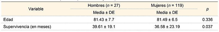 Se utilizó la prueba t de Student para comparar variables independientes. En el cuadro II no se observan diferencias en la edad. Sin embargo, existe una diferencia estadísticamente significativa en la supervivencia medida en meses (figura 1), lo cual muestra que los pacientes varones mueren antes que las mujeres.