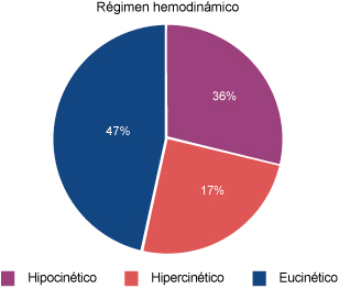 El régimen hemodinámico se clasificó como hipocinético (gasto cardiaco bajo y resistencias vasculares periféricas aumentadas), hipercinético (gasto cardiaco aumentado y resistencias periféricas bajas) o eucinético (gasto cardiaco y resistencias vasculares normales).