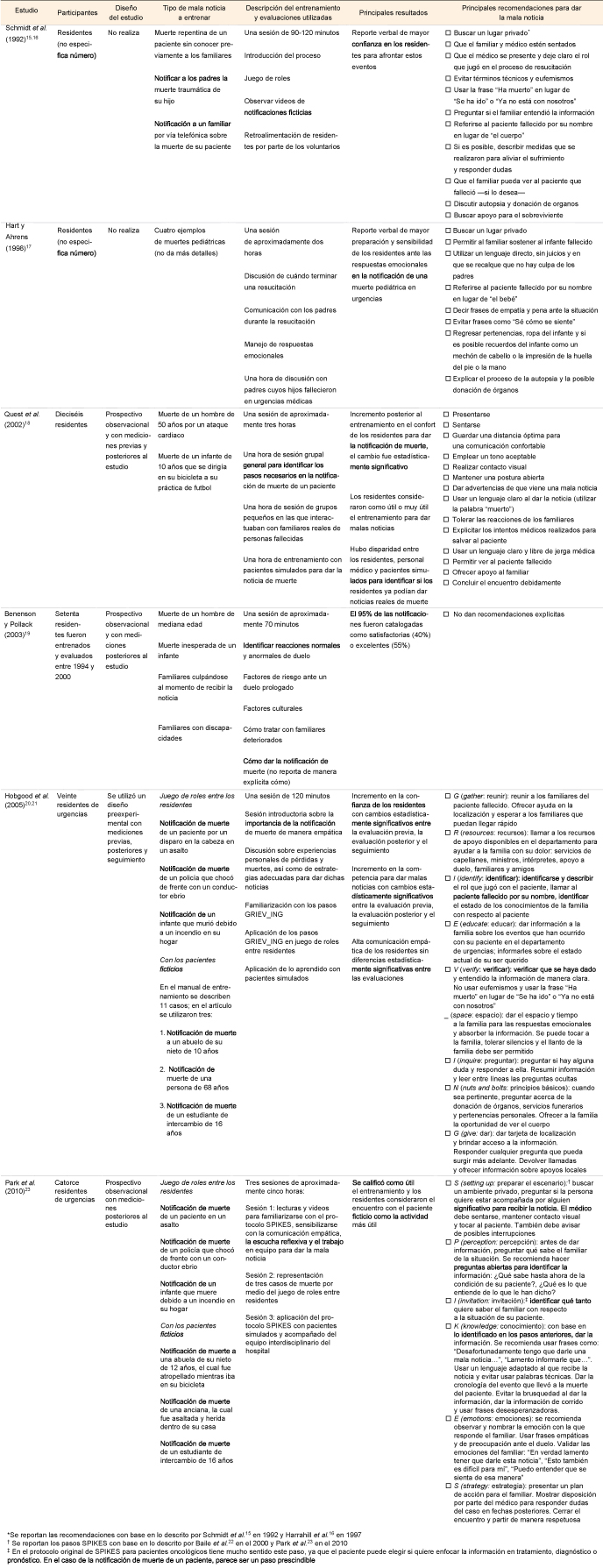 En el 2002 se realizó un estudio cuyo objetivo fue evaluar el confort y la utilidad de un entrenamiento para dar noticias de muertes en urgencias. Se evaluaron 16 residentes que asistieron a una sesión de tres horas: en la primera hora se le dio a todo el grupo información de los pasos para dar la noticia de muerte; al final de la sesión, se les entregaron folletos laminados con los pasos, a guisa de recordatorio; en la segunda hora se crearon grupos pequeños (no se especifica de cuántos participantes), a partir de los cuales los residentes interactuaron con dos miembros de la facultad de medicina y un familiar que tuvo la muerte de un ser querido, la cual fue notificada por un médico, a fin de que los residentes se sensibilizaran con las experiencias vividas por el familiar. Finalmente, durante la última hora, se les pidió a los residentes que dieran dos noticias a un familiar y se simuló la muerte de su ser querido. El desempeño de los residentes fue evaluado por ellos mismos, el personal médico de la facultad y aquellos que simularon ser pacientes. De igual forma, se tomaron evaluaciones antes y después de la intervención mediante instrumentos de autoinforme para identificar el confort al dar malas noticias y la utilidad del entrenamiento. Los resultados indicaron que hubo cambios estadísticamente significativos antes y después de la evaluación en el confort para dar malas noticias; los residentes consideraron el entrenamiento como útil y lo catalogaron como muy útil al darle la mala noticia al paciente simulado. Finalmente, llama la atención que hubo desacuerdo entre los residentes, el personal médico de la facultad y los que simularon ser pacientes, para identificar si los residentes ya podían dar noticias de muerte en ambientes reales, ya que los residentes se percibían con mayor habilidad (88%) de lo que los calificaban tanto el personal de la facultad (73%) como los pacientes simulados (63%).18