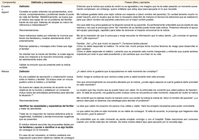 Es fundamental mostrar una actitud cálida, respetuosa, humana y empática ante las personas que reciben malas noticias. Algunos comportamientos útiles estriban en crear alianzas (darle a entender al familiar que se está ahí para que de manera conjunta se trabaje en seguir algunos pasos que le ayuden durante el evento), ser empático, mostrar rapport (tratar de entender la situación desde las creencias, perspectivas y cultura del que está recibiendo la noticia) y escuchar activamente lo que dice el familiar.24 Se pueden utilizar frases que ayuden a promover una mejor interacción empática y que le sirvan al personal médico para mostrar mejores habilidades de interacción con los familiares (cuadro II).24,25