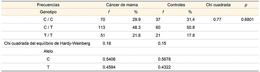 Las pacientes y los controles tenían edades similares. El rango de edad osciló entre 40 y 60 años. La mayoría de las pacientes con CM tenían neoplasias en etapa IIB y IIIB. Las frecuencias alélicas en pacientes fueron: C = 0.5406, T = 0.4594 y en controles C = 0.5678, T = 0.4322. La distribución genotípica en pacientes con CM fue: C/C = 29.9%, C/T = 48.3% y T/T = 21.8. La distribución en controles fue: C/C = 31.4%, C/T = 50.8%, T/T = 17.8% y las frecuencias alélicas fueron C = 0.567 y T = 0.432 (chi cuadrada 0.77, p = 0.6801) (cuadro I).