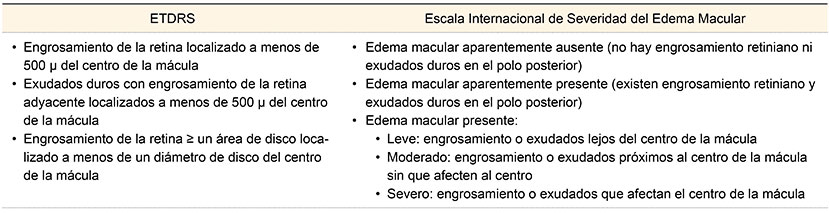 Una vez que el paciente es enviado al segundo nivel de atención, debería ser sometido a una evaluación oftalmológica que incluya historia clínica completa, toma de agudeza visual (cartilla de Snellen o ETDRS), toma de presión intraocular, valoración de segmento anterior y exploración de fondo de ojo bajo midriasis farmacológica para evaluación correcta de la retina. De acuerdo con la exploración previa, se determinará el estado clínico del paciente y se procederá a clasificar clínicamente el EMD y a derivarlo al tercer nivel de acuerdo con la valoración previa. Con respecto a la clasificación clínica del EMD se consideraron las clasificaciones del ETDRS25 y la Escala Internacional de Severidad del EMD (cuadro I).26