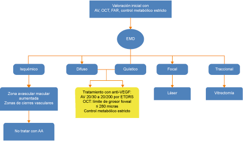 Una vez establecido el diagnóstico clínico, el paciente será sometido a exámenes paraclínicos de gran importancia pronóstica para el tratamiento, como la fluorangiografía retiniana (FAR) y la tomografía de coherencia óptica (OCT, por sus siglas en inglés). Los estudios FAR se llevarán a cabo en pacientes que no sean alérgicos al medio de contraste y cuya función renal no se encuentre comprometida; este estudio permite apreciar la filtración capilar que se produce en la retinopatía diabética. Según esta filtración, se clasifica el EMD en focal o difuso.27 El EMD focal es aquel que se produce por la filtración de uno o algunos microaneurismas o lesiones capilares fácilmente identificables. El EMD difuso es aquel que se produce por una afectación capilar más extensa, a menudo distribuida en forma dispersa en el área macular, lo cual da una imagen de filtración difusa que no permite individualizar el o los orígenes de la filtración. El EMD difuso se asocia a menudo con la producción de quistes retinianos a nivel de la mácula y genera el tercer tipo de edema, el EMD quístico.27 La FAR puede identificar isquemia capilar en la fóvea o incluso en toda el área macular. La isquemia es la causa de la pérdida visual severa o bien de la falta de respuesta al tratamiento; este tipo de edema se clasifica como EMD isquémico (algoritmo 1).27