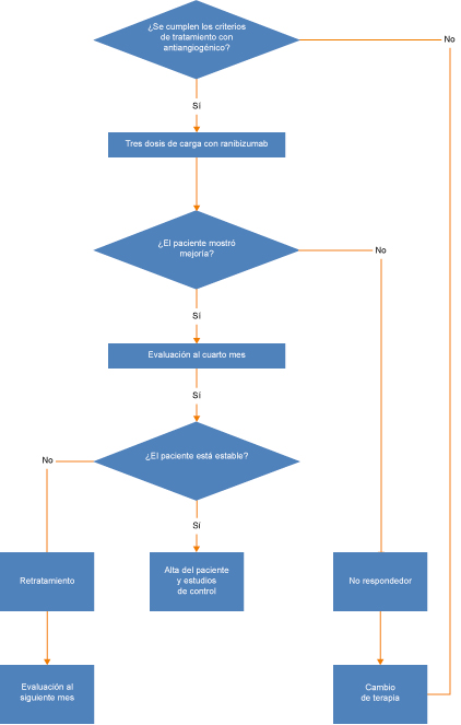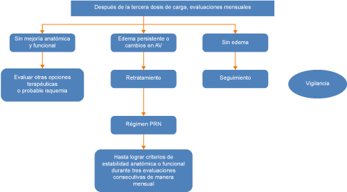 Una vez que el paciente ha sido considerado candidato a tratamiento con antiangiogénico, se recomienda comenzar con el esquema de tratamiento resumido en el algoritmo 2, que se ha desarrollado para el uso de ranibizumab en el IMSS. El estudio multicéntrico RESOLVE demostró que el esquema de tratamiento mensual con ranibizumab intravítreo por 12 meses representó ganancias visuales de hasta + 10.3 letras ETDRS.18 Posteriormente, los estudios RIDE, RISE y RESTORE probaron la eficacia del régimen por razón necesaria (pro re nata o PRN), que consiste en una dosis de carga de tres meses consecutivos seguida de evaluaciones mensuales para determinar la necesidad de retratamiento con base en los resultados de AV y/u OCT.20,21 Con esto, el número de inyecciones promedio en el primer año de tratamiento es de nueve, con ganancias visuales de + 6 a + 9 letras ETDRS.20,21 El régimen PRN ayuda a no inyectar al paciente mensualmente pero sí a captar oportunamente los cambios en OCT o baja visual que sugiera la necesidad de retratamiento.20 Por otra parte, el estudio RETAIN demostró la no inferioridad del régimen tratar y extender (T&E) con ranibizumab 0.5 mg frente a ranibizumab 0.5 mg PRN y concluye que el esquema T&E ayuda a disminuir las visitas al médico, pero no necesariamente a disminuir el número de inyecciones.29