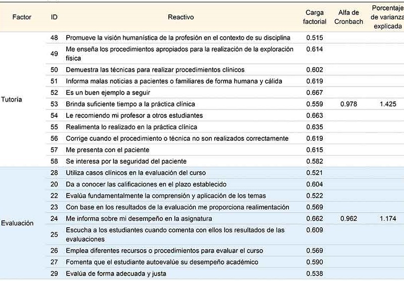 Evaluación: valora la aplicación de diversos procedimientos para evaluar de forma justa y pertinente la comprensión y el dominio de los conocimientos del estudiante, la realimentación oportuna sobre los resultados de evaluación y la motivación al alumno para su autoevaluación. Este es el factor con menor valoración, por lo que representa un área de oportunidad para mejorar el desempeño docente de los clínicos.