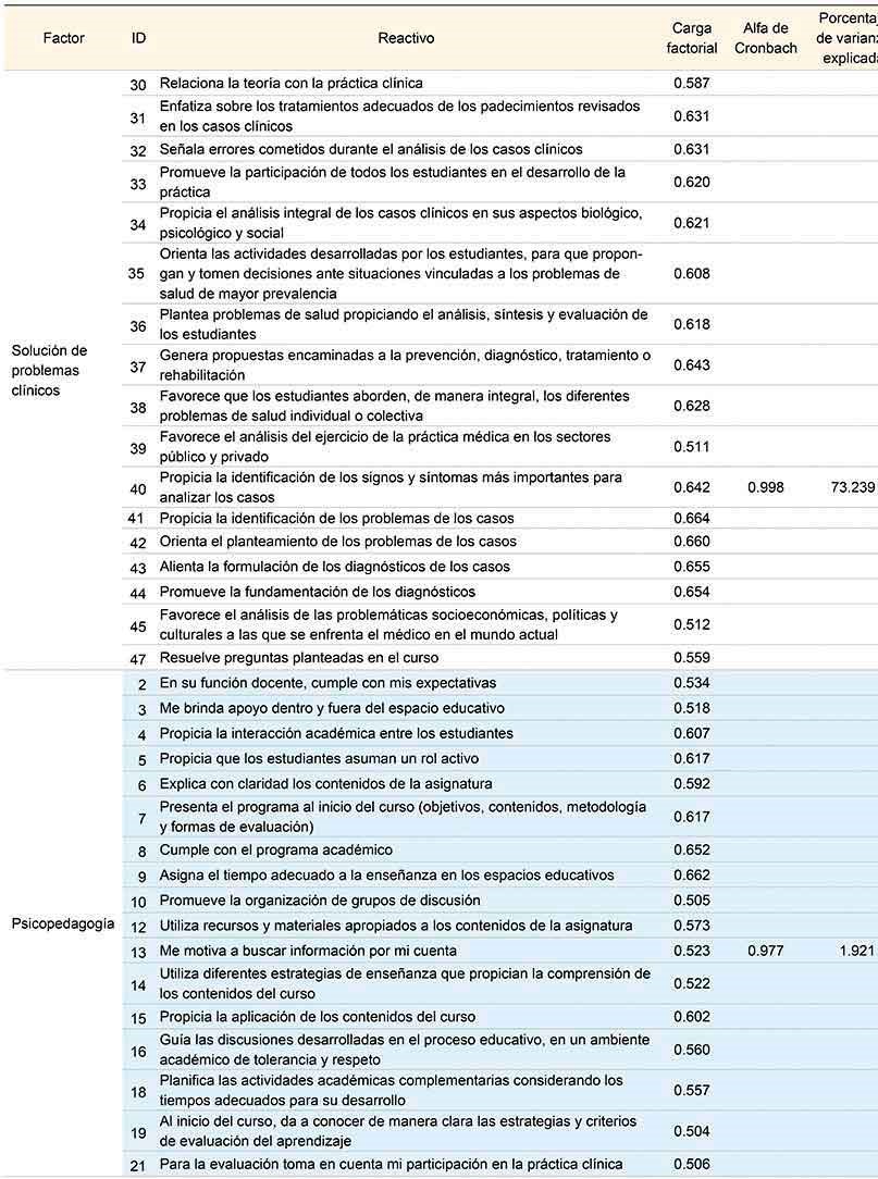 Solución de problemas clínicos: evalúa el desempeño docente en cuanto al análisis y la solución de situaciones, casos y problemas clínicos en el ámbito médico, mediante una aproximación integral que incluye la identificación del problema, su planteamiento dentro del contexto de la práctica médica, el análisis de casos, la formulación de diagnósticos y la propuesta de tratamiento; todo encauzado a que el estudiante desarrolle el pensamiento crítico, el razonamiento clínico y la toma de decisiones basadas en evidencia. De hecho, este es el factor de mayor relevancia en la evaluación de la competencia docente en el Internado Médico de Pregrado, con una varianza explicada de 73.2%. Esto se debe probablemente a que los programas académicos y los docentes clínicos hacen hincapié en el razonamiento clínico para la solución de problemas.